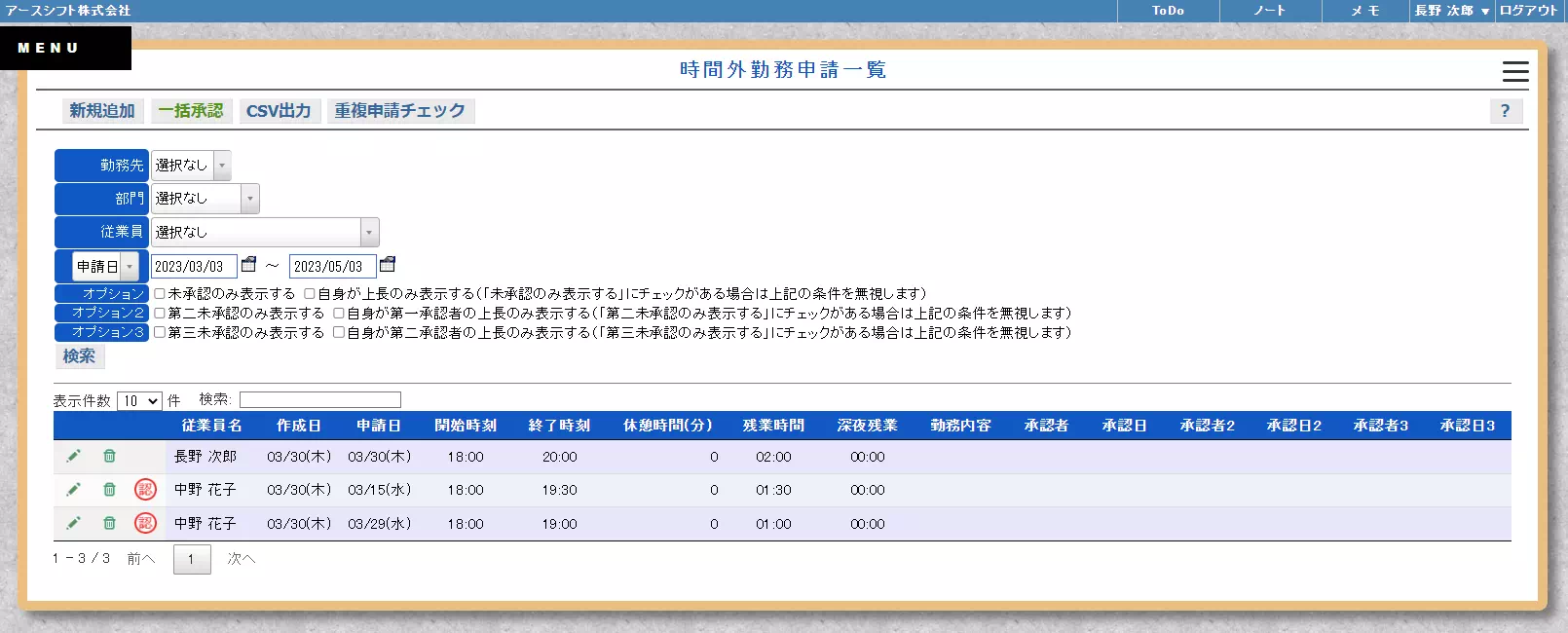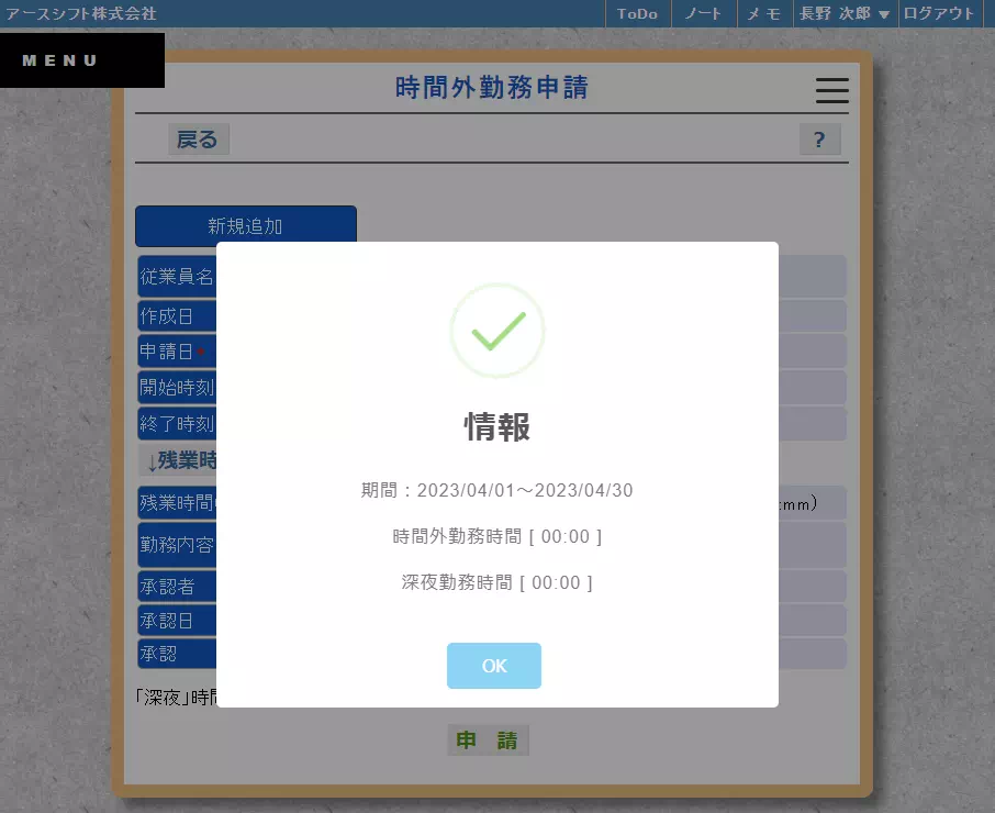 時間外申請で申請をした勤務時間が勤務実績表に反映されます。