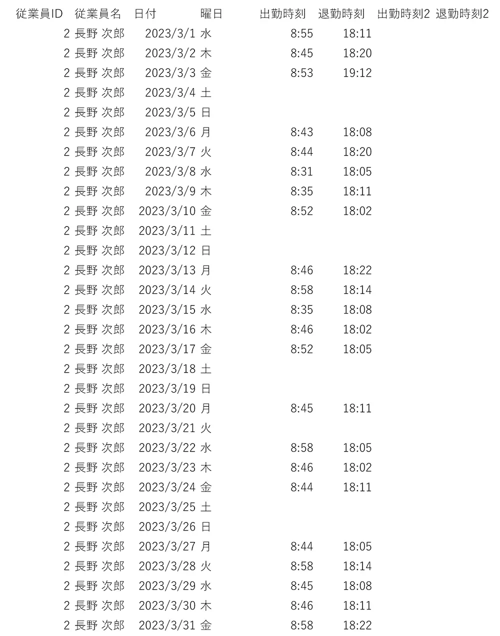 データの中身は、従業員ID、従業員名、日付、曜日、出勤時間(1~6)、退勤時間(1~6)を出力する事ができます。