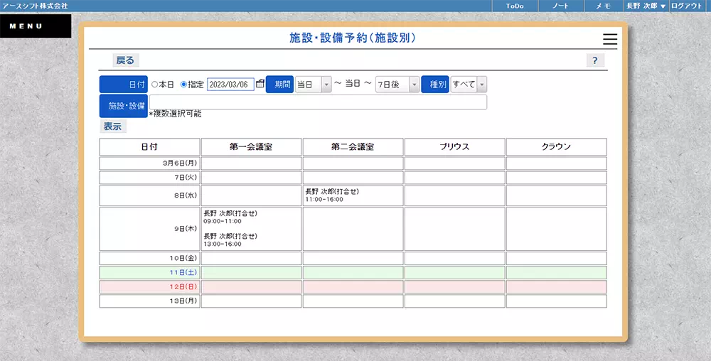 また施設別でいつどの施設・設備に予約が入っているか調べる事も出来ます。