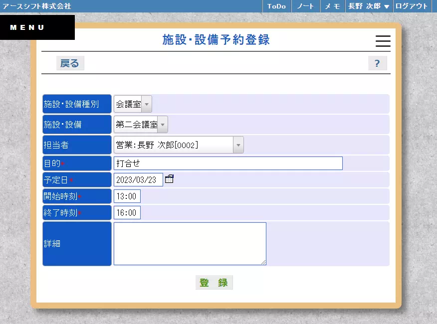 予約登録は、施設・設備、担当者、目的、予定日、予約開始時刻、予約終了時刻等を入力する事ができます。