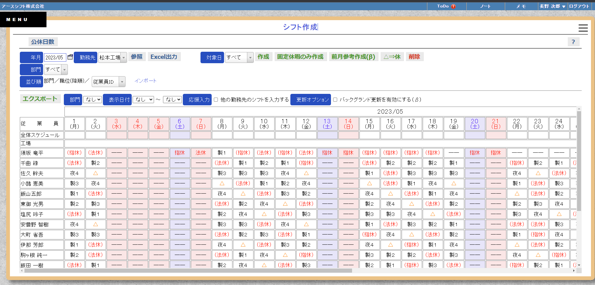 出力条件として、対象の年月・勤務先・部門・従業員を指定して検索をして勤務予定をExcelで出力する事ができます。