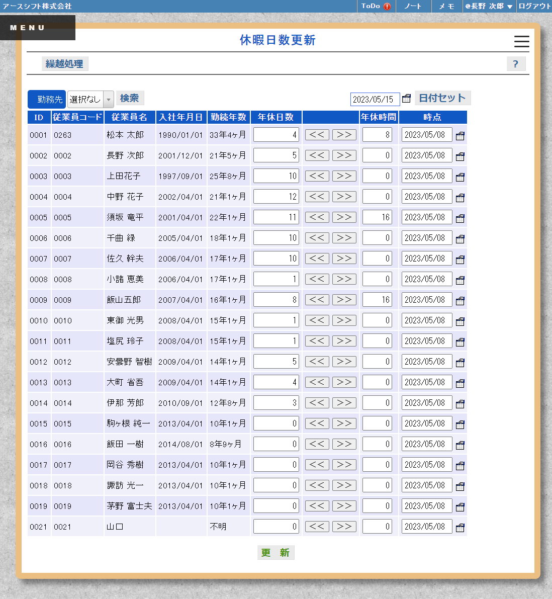 繰越は各従業員に登録されている入社年月日を基に継続勤務年数から年次有給休暇の付与日数の自動計算を行い、付与される休暇日数が表示されます。