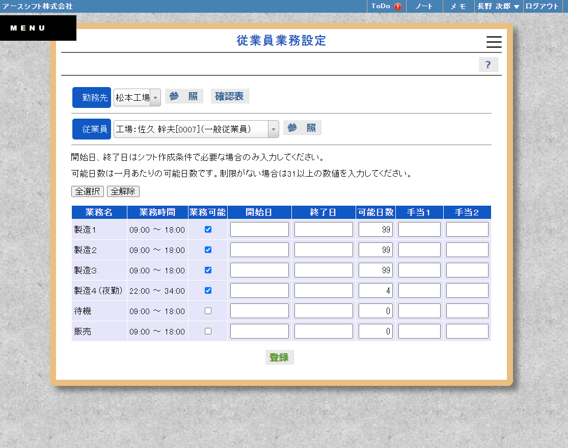 作業依頼者は、個別または複数の従業員に対して、依頼日、依頼期限、作業分類、作業内容等の情報を登録する事ができます。