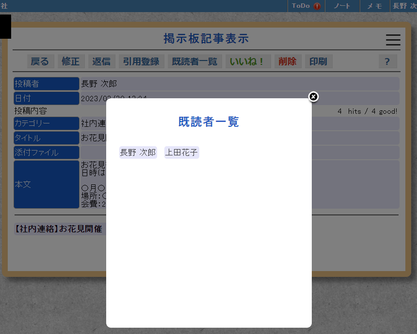 掲示板機能は従業員のコミュニケーションツールとして誰でも書き込みや閲覧ができます。