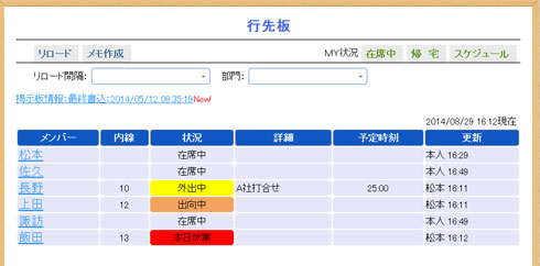 コミュニティツール 週刊・月間のスケジュール管理です。部門・個人の絞り込みが可能です。同行者などがいる場合は同時に複数名を登録・変更できます。スケジュールで登録されたとおりに行先版が連動するので便利にご利用いただけます。スマートフォンからは自分のスケジュールのみ変更できます。 イーサース® メニュー for Biz 料金 メニュー for Biz 料金 Copyright (C) 2022 EarthSystem Co.,Ltd. All rights reserved.