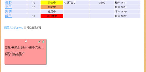 机やパソコンのモニタに張り付けていた付箋の内容を、行先情報画面上に張り付ける事が出来ます。
